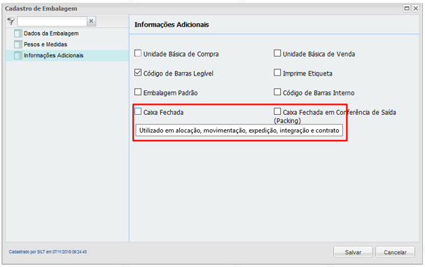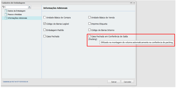 Insertamos el parámetro:Caja cerrada en conferencia saliente (embalaje) que, cuando se configura y, de acuerdo con la Configuración Wave, al generar automáticamente volumen en Packing, incluso si el empaque tiene un factor mayor a 1, puedeno ser considerado como “Caja Cerrada” para la generación de volumen.