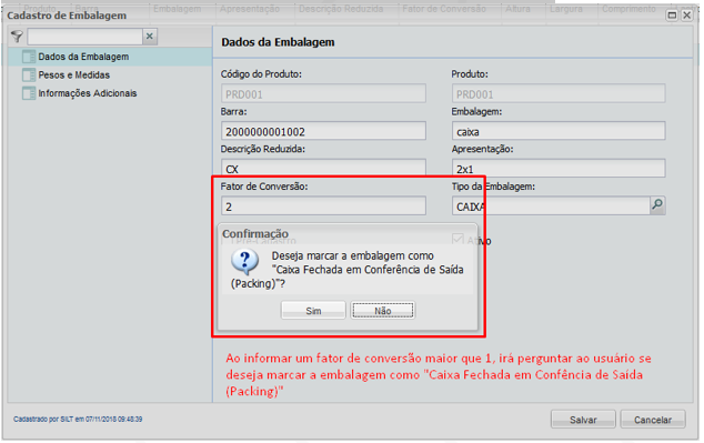 Al registrar un nuevo paquete con un factor mayor que 1, el sistema pregunta al usuario si desea que el paquete se marque comoCaja cerrada en conferencia saliente (embalaje).