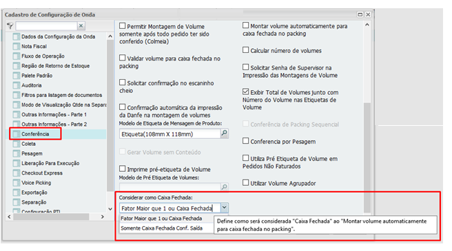 En Wave Configuration, en el submenú Conference, se agregó un nuevo parámetro,Considerar como caja cerrada, define cómo el sistema lo considera como Caja Cerrada cuandoMontar automáticamente el volumen para caja cerrada en el embalaje. en el mismo menú de conferencias.