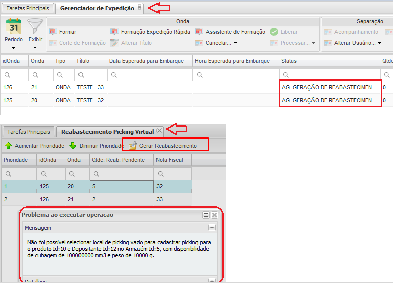 Por lo tanto, ajustamos el proceso en la versión 8.11.5.131 y desde las versiones 8.12.0.0 en adelante, para poder identificar fácilmente las ondas que tienen oNo la necesidad de recargas. Si hay stock suficiente, el único problema es la falta de disponibilidad de pickings vacíos, lo que permite al gerente dirigir preferentemente las olas queno necesitan reabastecimiento, lo que también ayuda a liberar espacio de recolección, lo que permite que la rutina de formación de olas tenga una menor incidencia de errores debido a la falta de recolección libre para registrar la recolección en vivo.