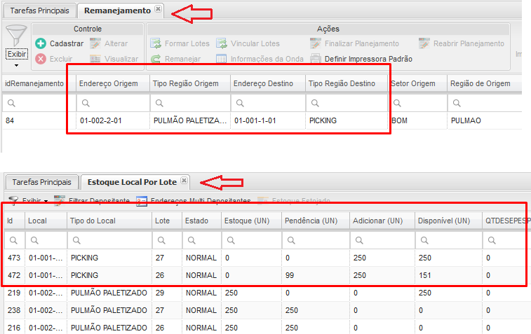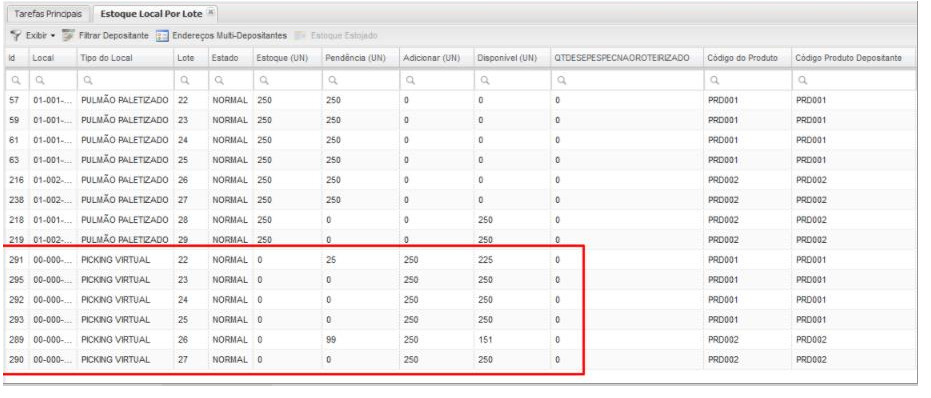 Tenga en cuenta que el sistemaNo mueve la acción a laRecogida virtual, genera sólopendencia en el pulmón yagregar En el picking virtual, cuando surge una vacante en el picking físico, se realiza la reposición y se pasa directamente al picking. Es posible tener una mejor visión de este movimiento en la pantalla Stock Local por Lote.
