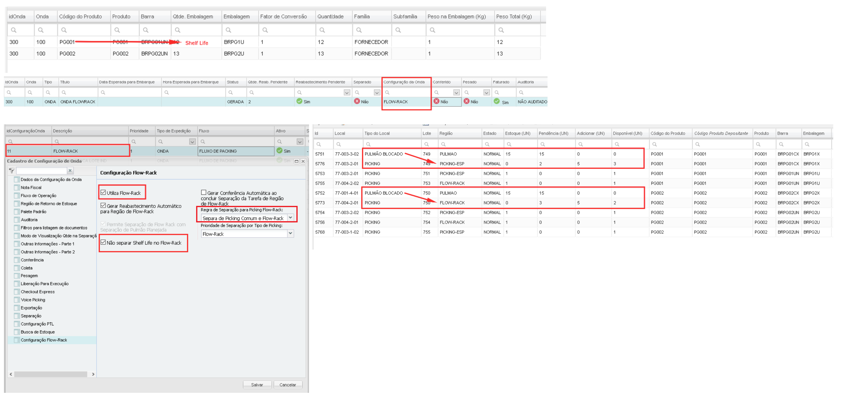 Los dos productos (PG001 y PG002) están en la misma factura / oleada, pero el producto PG001 tiene vida útil y por lo tanto se separó de la Región Picking-Esp (Picking Especial) y el producto PG002 se separó del Flow-Rack región.