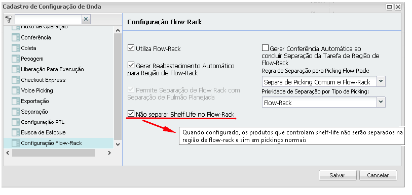 Incluimos el parámetroNo separe Self Life en Flow-Rack en la pantalla de registro de Wave Setup para determinar qué productos están configurados para operar con Shelf Lifeno separarse en direcciones de rack de flujo y sí en la dirección de TIPO:PICKING, con el parámetro Picking especial marcado - informado arriba.
