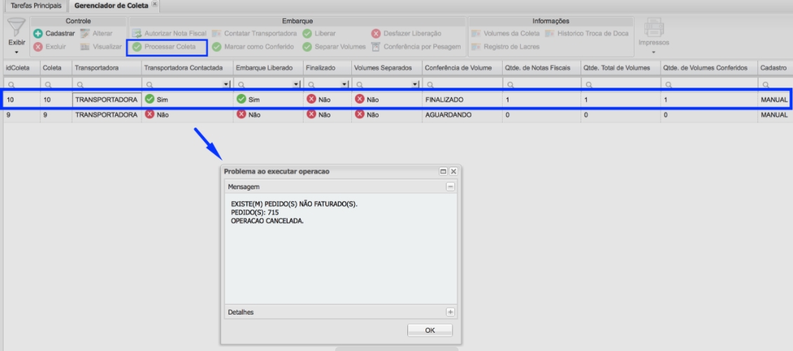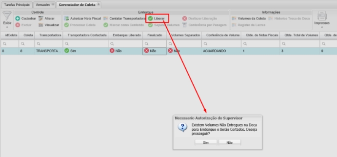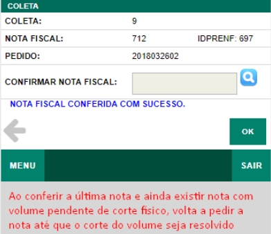 Al campoOrden de conferencia en colección: deja la opción configuradaFactura por Seq. Entrega más tarde sus Volúmenes (orden descendente de la Secuencia de Entrega NF):, para que el usuario pueda cortar el volumen, el depositante debe iniciar la verificación por la factura.