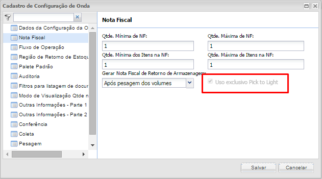 - Se insertó en Wave Configuration> Factura> el parámetroUso exclusivo Pick to Light: define si la onda es para uso exclusivo de PTL. Solo se permite vincular facturas que estén activas conElegir a la luz, pero el sistemano l