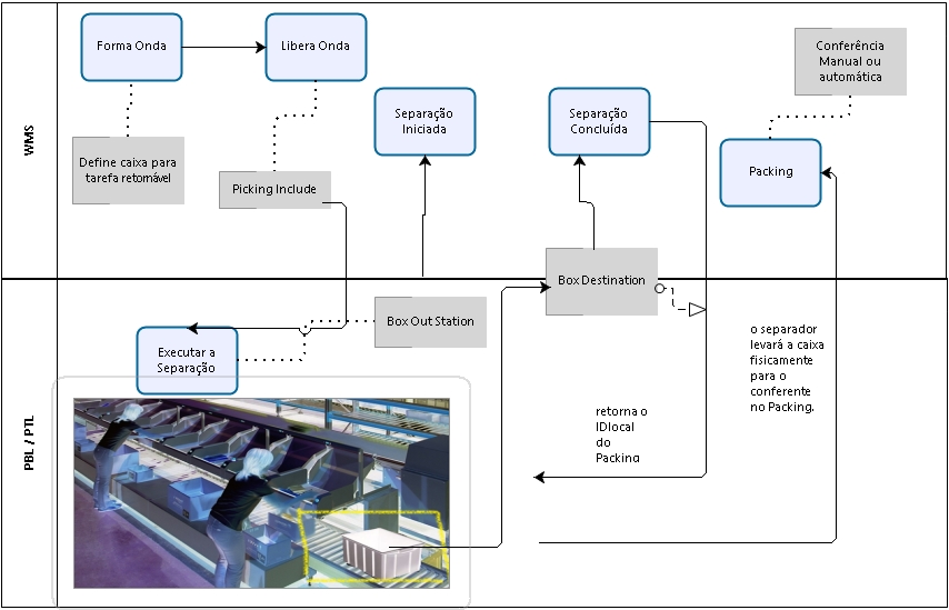 En este proceso, el WMS envía después de liberar ondas, todas las separaciones dePORrepugnanteTOLigth o POR repugnanteBy L igth da Onda al tercer sistema, además de asignar a cada tarea de separación unCaja de volumen retornable, haciendo la separación unidad por unidad.