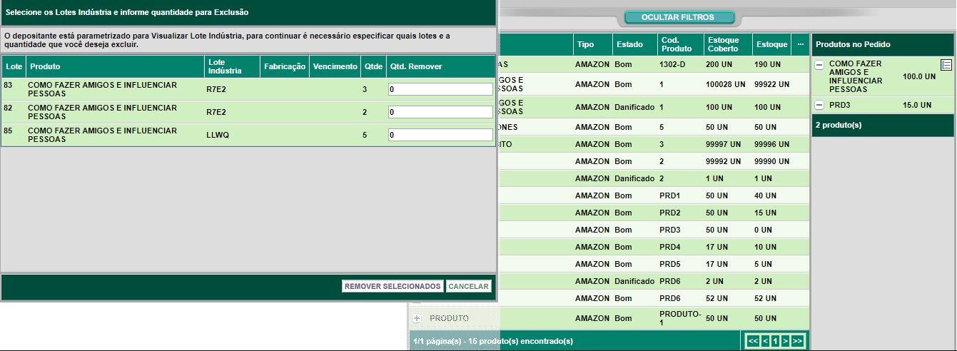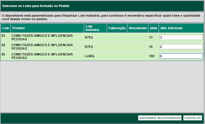 ElLotes de la Industria oInformación específica que se agregaron al pedido, y si se eliminan, se mostrará una nueva ventana para seleccionar cuáles y cuántos se eliminarán, siempre y cuando el parámetroVer el lote de la industria y la fecha de vencimiento al agregar/eliminar el pedido se activa en el Registro de Depositante.