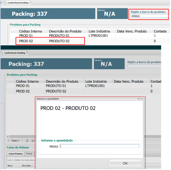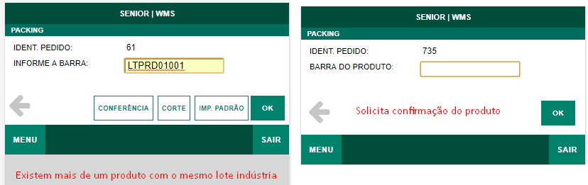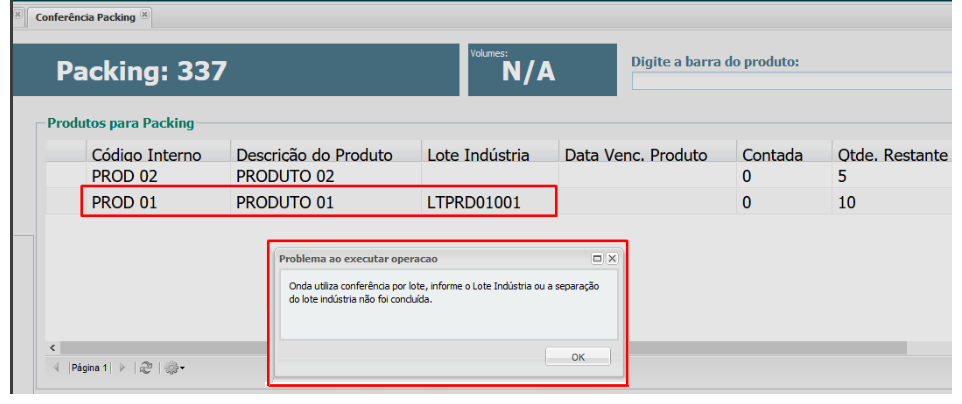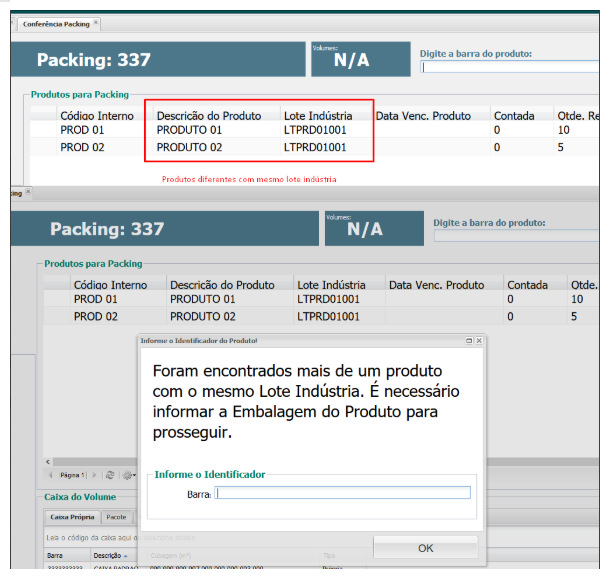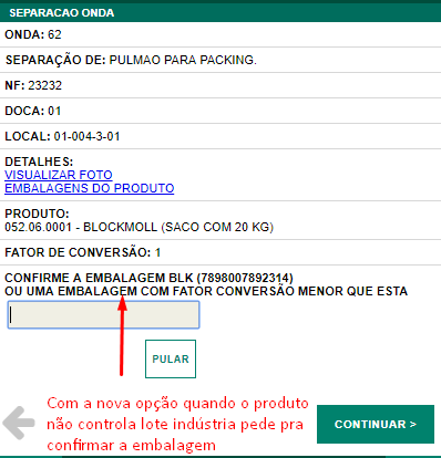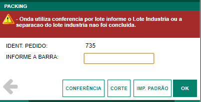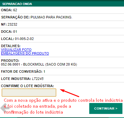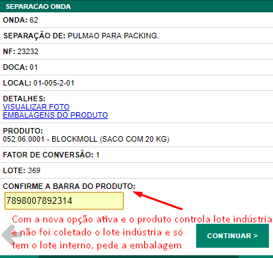 Si el producto informóIndustria de lotes de control, luego el sistema primero solicita el Lote de la Industria y luego se informa el código de empaque para que el sistema identifique el factor de conversión conferido. Si se lee directamente un paquete de un producto que controla el lote de la industria, se muestra un mensaje en la pantalla que informa al usuario que para este producto, se informa primero al lote de la industria, lo que requiere que el usuario confirme la lectura del mensaje.