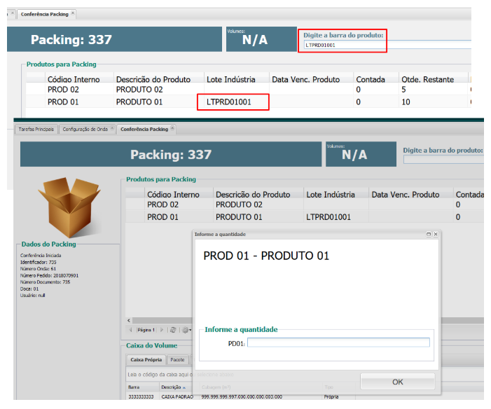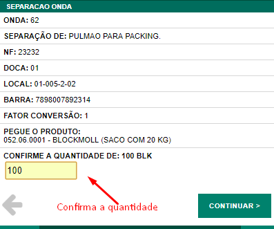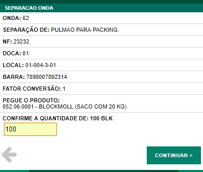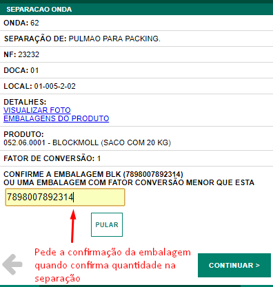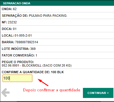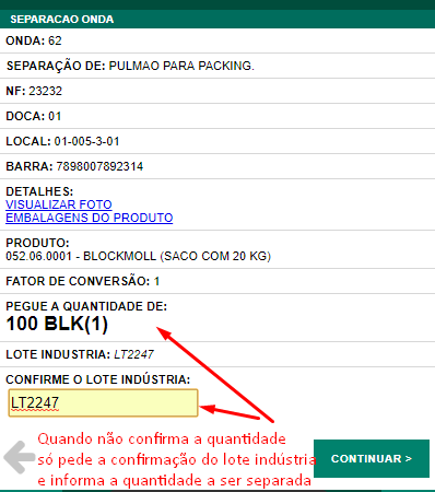control el WMS primero solicita el lote industrial, luego muestra la cantidad a separar con sus factores de conversión. Ej: tome 15 CX (10) y 7 UN. Pero si el sistema está configurado paraSolicitar la cantidad al usuario, también es necesario confirmar el empaque que el usuario encontró en la dirección luego de informar al lote de la industria.