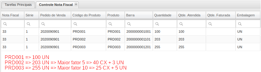 - Solicitamos 203 unidades de PRD002, y con el factor de empaque más grande igual a 5, el sistema cumple con 40cx (trunc(203/5)) en el factor 5, dejando 3 unidades restantes.
