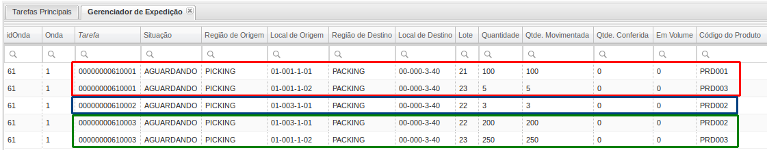 - También solicitamos 100 unidades de PRD001, pero este producto solo tiene empaque factor 1 que no es una caja cerrada, por lo que el sistema utiliza la regla estándar para generar pallets. Sumando a este producto las cantidades restantes de 3 unidades de PRD002 y 5 unidades de PRD003.