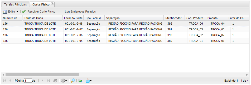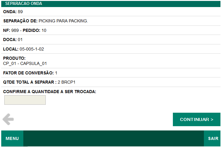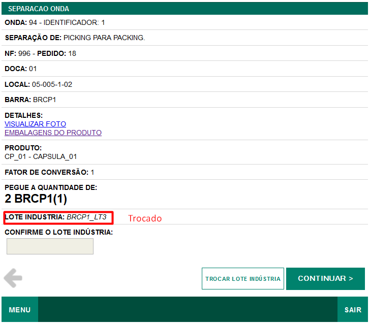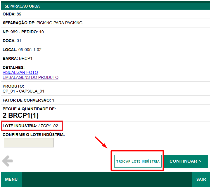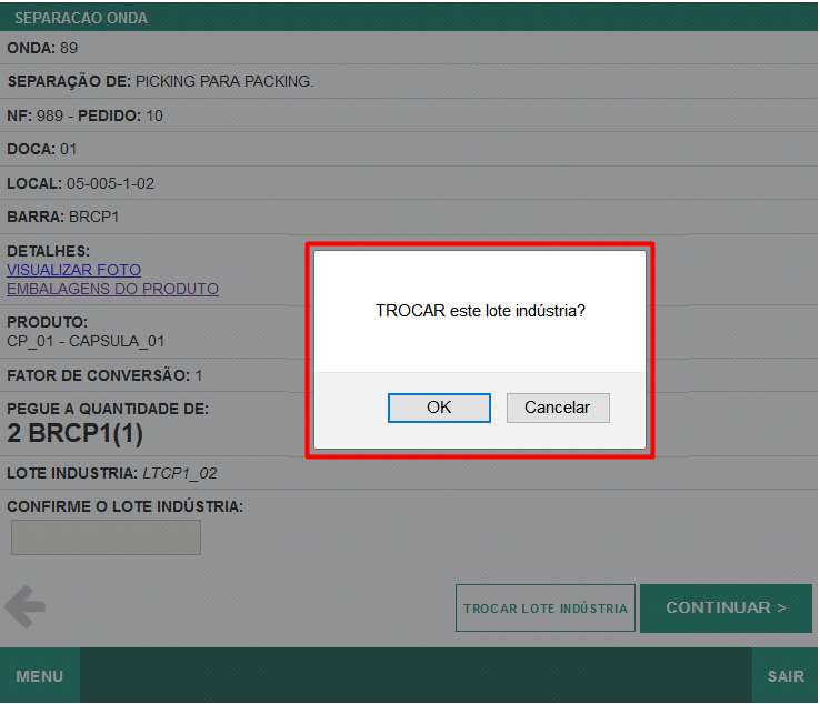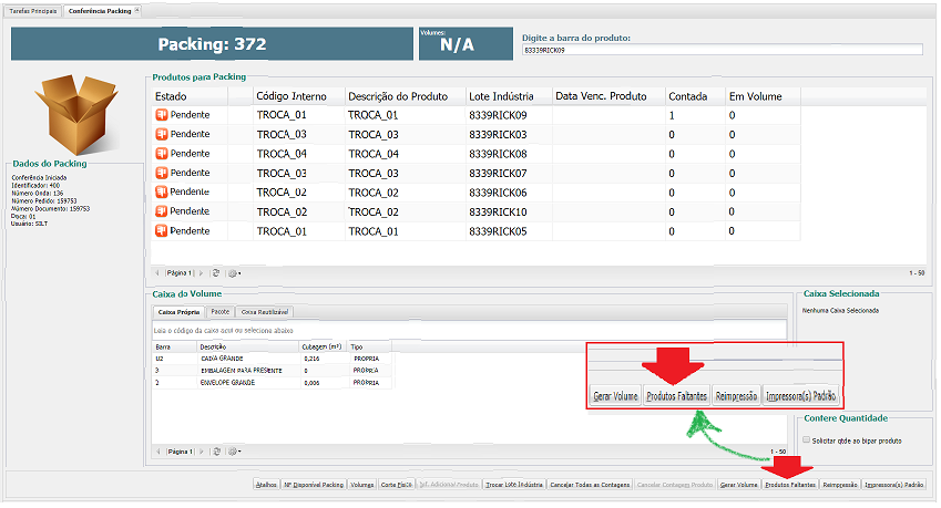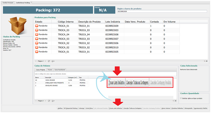 - Si los productosno se encuentran físicamente, el usuario tiene la opción de solicitar un intercambio por lotes de la industria por separado. En este caso, el WMS solicita una nueva separación de los productos que,no Fueron entregados al empaque físicamente, pero fueron entregados al empaque por el sistema, y con ello se produce el cambio de Lote de Industria inicialmente previsto.