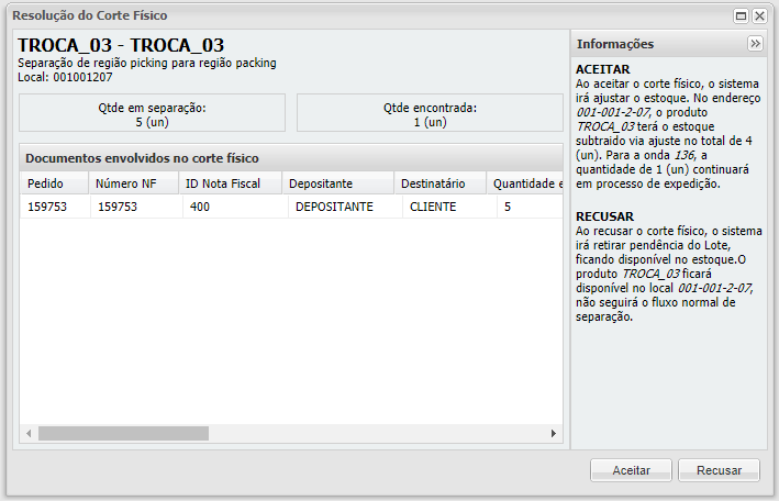 Nota: este tipo de Corte Físico es diferente al Corte Físico actual, debido a que el sistema ha buscado otro lote industrial para su separación. Así, cuando se acepta,no las cantidades previstas en el pedido / factura se modifican, así como cuando se rechazan, no hace que se cree una nueva actividad de clasificación, ya que esto ya ocurrió en el intercambio del lote industrial.