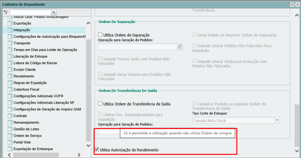 Agregamos al Registro de Depositante, el parámetro:Utiliza autorización de recibo que solo permite sermarcado este parámetro sino está marcado el parámetro Usar orden de compra o eso no está pendiente de completar una orden de compra. Si este parámetro esmarcado y está desmarcado, el sistema primero valida si tiene ono enlace con un OR (orden de recepción). Se utiliza en la integración del archivo XML referente al Inbound ASN (Receipt Authorization).