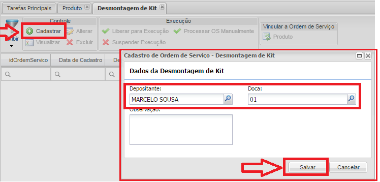 Acceda al Menú: Servicios> Desmontaje del kit, haga clic en el botónREGISTRAR, complete los campos resaltados y haga clic en el botónAHORRAR.