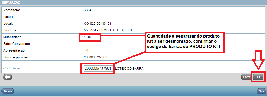 Separe la cantidad informada en el recolector, luego confirme el código de barras delPRODUCTOEQUIPO para ser desmontado.