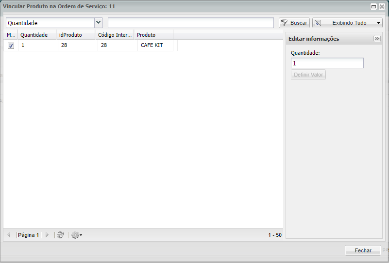 Abre la pantalla para vincular componentes a laPRODUCTO DEL KIT, y justo después de ejecutar el filtro, seleccione el producto componente, definiendo la cantidad y haga clic en el botón DEFINIR VALOR, luego de hacer el enlace detodos los componentes, haga clic en el botónCERRAR.