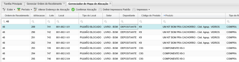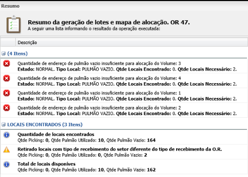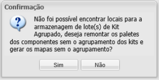 Cambiamos la rutina de generación de lotes y mapas para que, cuando se configura el kit agrupado y se definen códigos de agrupación en la receta, los componentes del kit se agrupan considerando sus códigos de agrupación y número de juegos por pallet, generando la asignación de volúmenes en ubicaciones vacías. pulmones. Cuando no se encuentran suficientes direcciones para la asignación de volúmenes, el sistema pregunta al usuario si desea volver a paletizar los materiales de forma no agrupada, en cuyo caso opta por esta alternativa, los lotes se generan de forma tradicional.