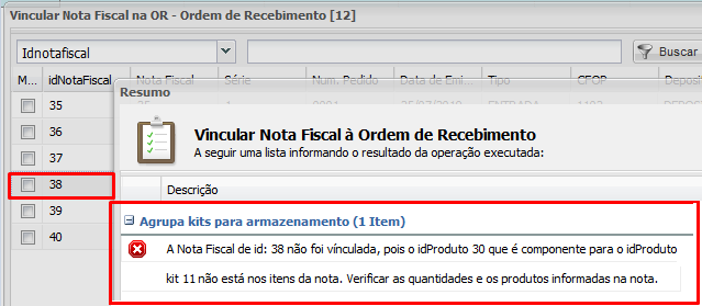 Mensaje de error al vincular la nota con un componente faltante y con una cantidad de componentes diferentes: