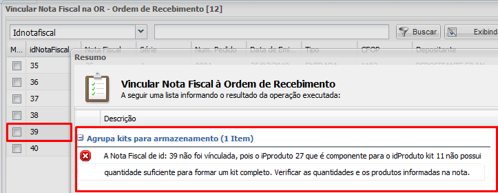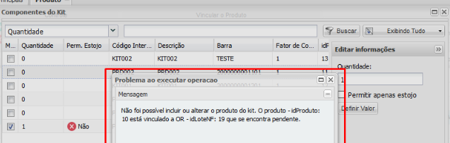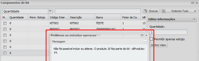 - Si la cantidad informadano ya sea un valor múltiple de lo que hay en stock o, si la cantidad no forma el mismo número de kits completos, se muestra el mensaje crítico:No fue posible agregar o cambiar el producto del kit. La cantidad informada no forma kit (s) completo (s).
