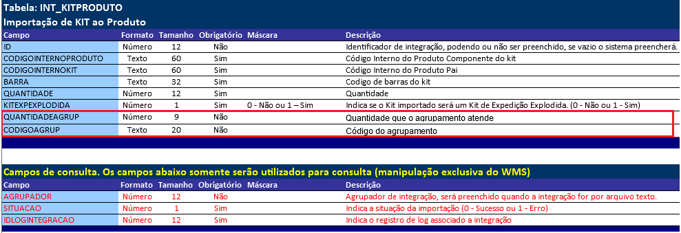 - Particularidad de los campos informados a continuación, ya que el parámetroKit de almacenamiento de componentes de grupo está marcado para este producto: