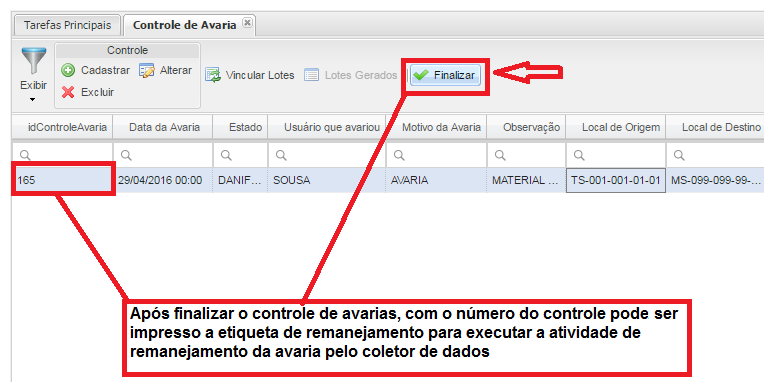 Después de vincular los lotes, seleccione el registro de daños y haga clic en el botónTERMINAR, para finalizar la planificación delCONTROL ENFALLA.