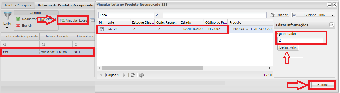 Después de registrar la devolución del producto recuperado, seleccione el registro y haga clic en el botónENLACEUN MONTÓN, después de abrir la pantalla de ENLACE UN MONTÓN , Selecciona elLOTE, defina la cantidad de producto a recuperar y haga clic en el botónDEFINIRVALOR, después de configurar el valor, haga clic en el botónCERRAR.