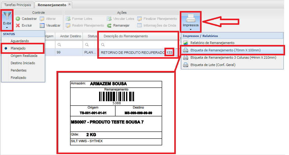 Imprima la etiqueta de reubicación, cambie el estado para mostrar la reubicación planificada, seleccione e imprima la etiqueta de reubicación que se utiliza en el recopilador de datos, filtre por campoDESCRIPCIÓN DELREEMPLAZO. Se describe "REGRESO ENPRODUCTORECUPERADO: ”Y el Código de registro del producto recuperado.