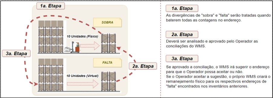 - Falta: el WMS moverá el saldo virtualmente a la dirección destinada a recibir artículos “agotados” y luego liberará la dirección para movimiento, promoviendo el ajuste de stock.