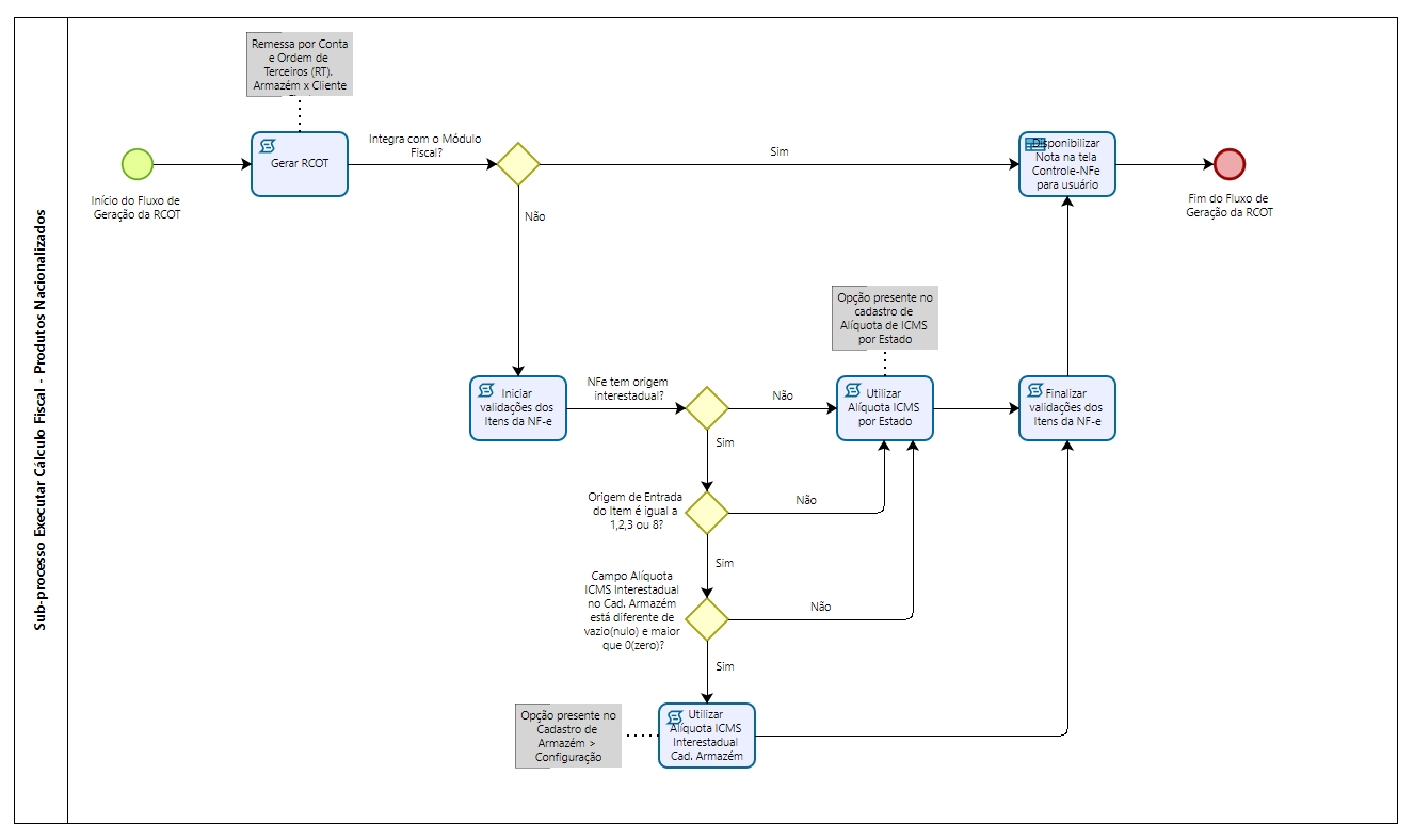 Al generar una factura (RCOT), el sistema utiliza diferentes reglas impositivas para calcular los valores gravados para cada artículo. El flujo de productos nacionalizados forma parte de una de estas reglas, y se utiliza para orientar el valor correcto (según la SEFAZ) de la tasa ICMS para cada rubro.