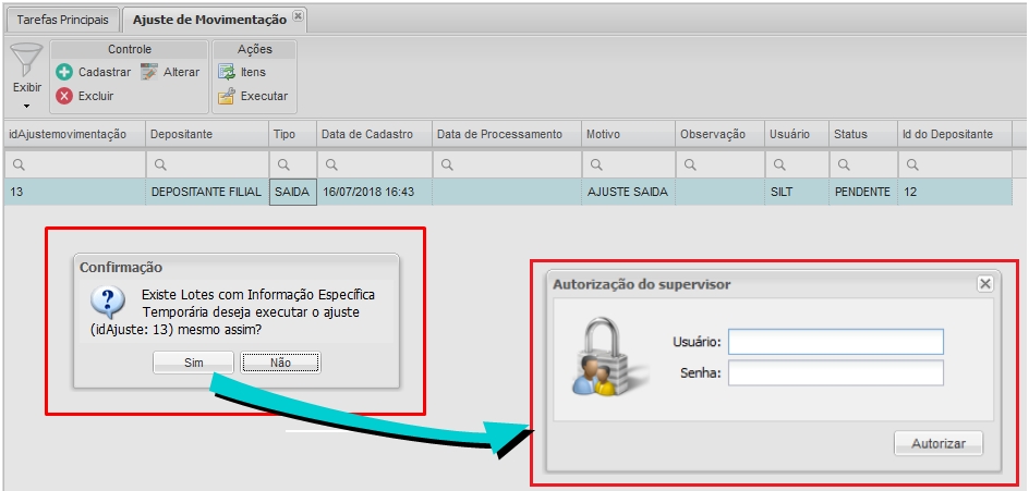 En la pantalla Ajuste de movimiento de salida, si hay lotes de productos que controlan información específica y queno la información ha sido intercambiadatemporal Para eldefinitivo muestra el mensaje de que el producto no cuenta con Información Específica Definitiva, y para completar el proceso es necesaria la Confirmación del Supervisor y el Registro de Log.