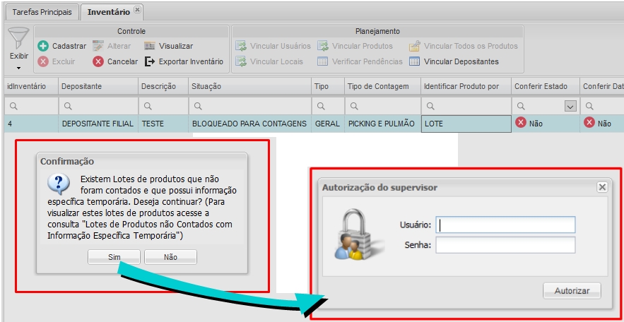 En el Inventario alActualizar stock, el sistema verifica si hay algún producto en el enlace que Controla la Información Específica Temporal y que esté en stock yno fueron contados, presentando un mensaje informando la situación y preguntando si desea continuar. Si confirma, se solicita Autorización de supervisor, con registro de registro y visualización de datos en el Informe:Lotes de productos no contados con información específica temporal.