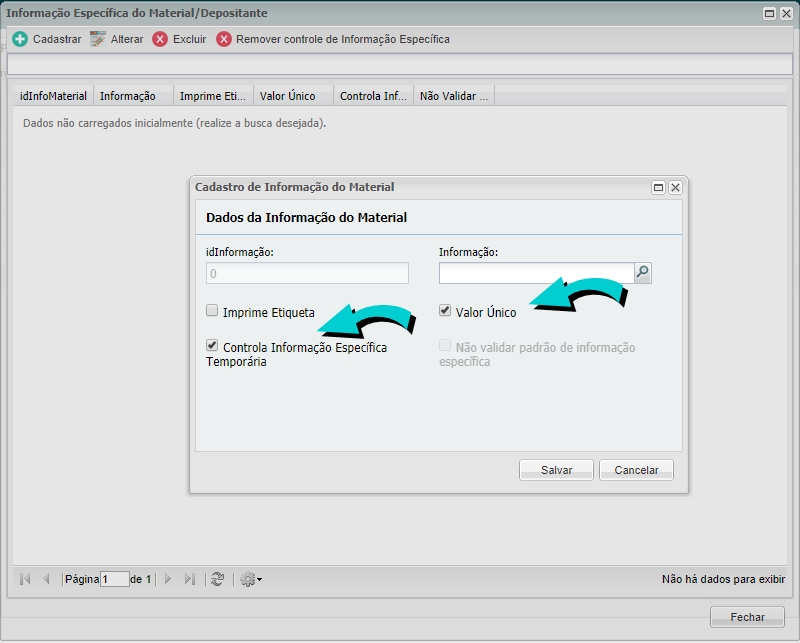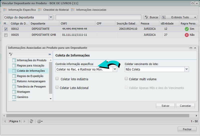 - Controla la información específica temporal: está habilitado para marcar ono si en el campoControl de información específica, Producto x Depositante> Información asociada se establece en Recoger en Rec. y seguimiento en Mov y el campoValor único está chequeado.