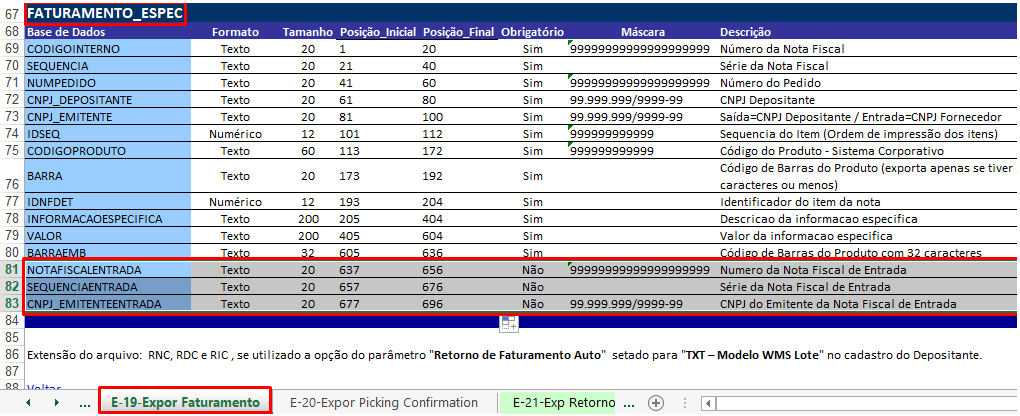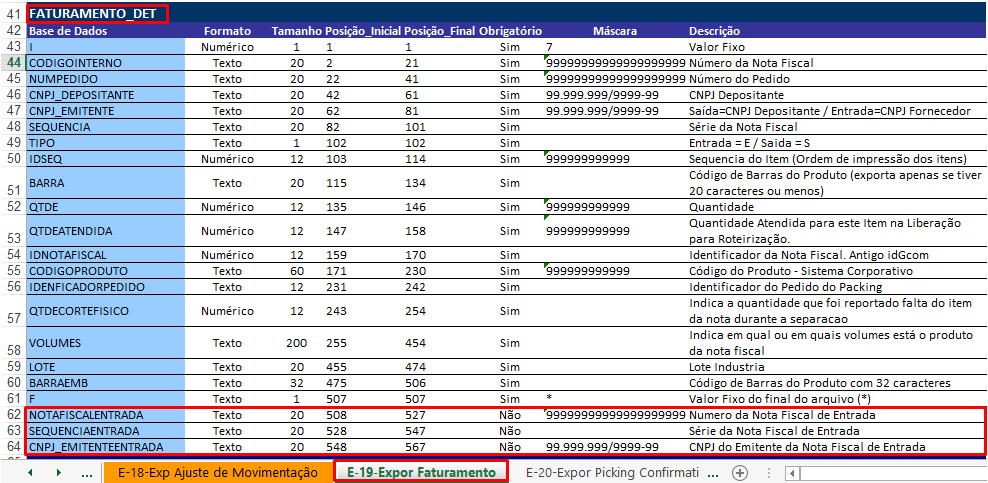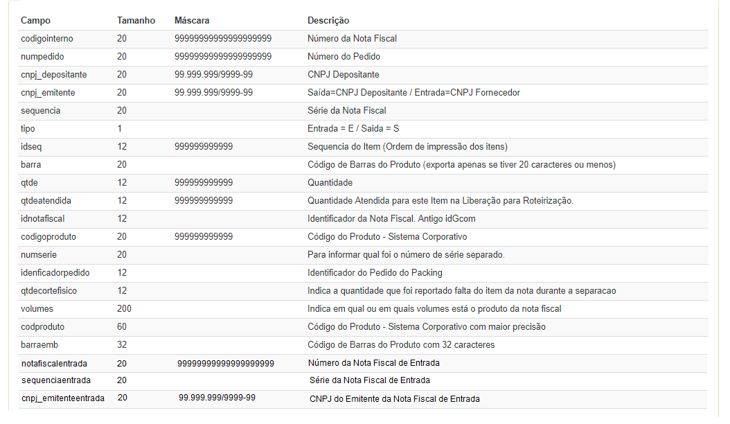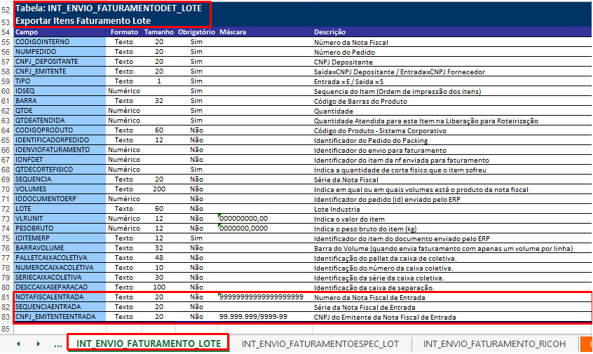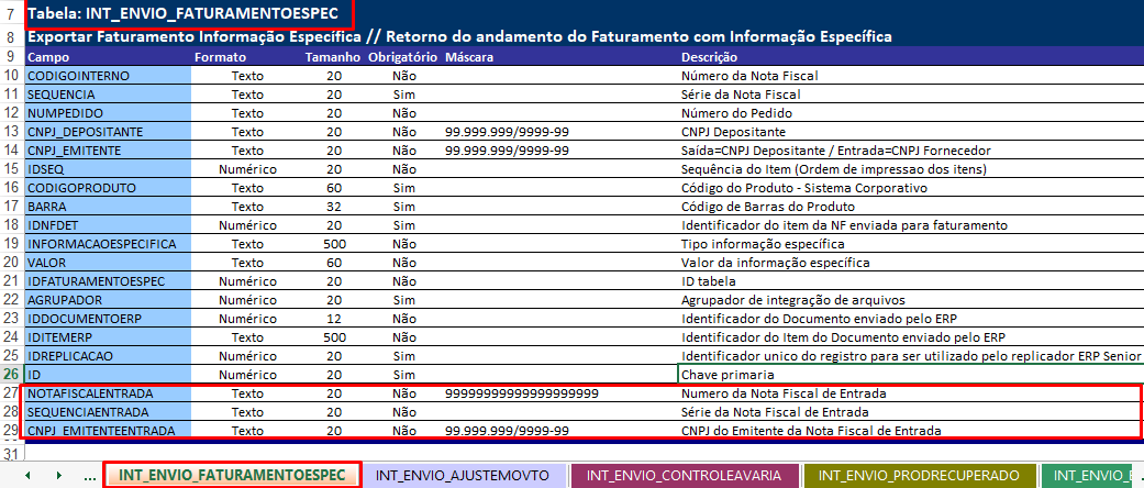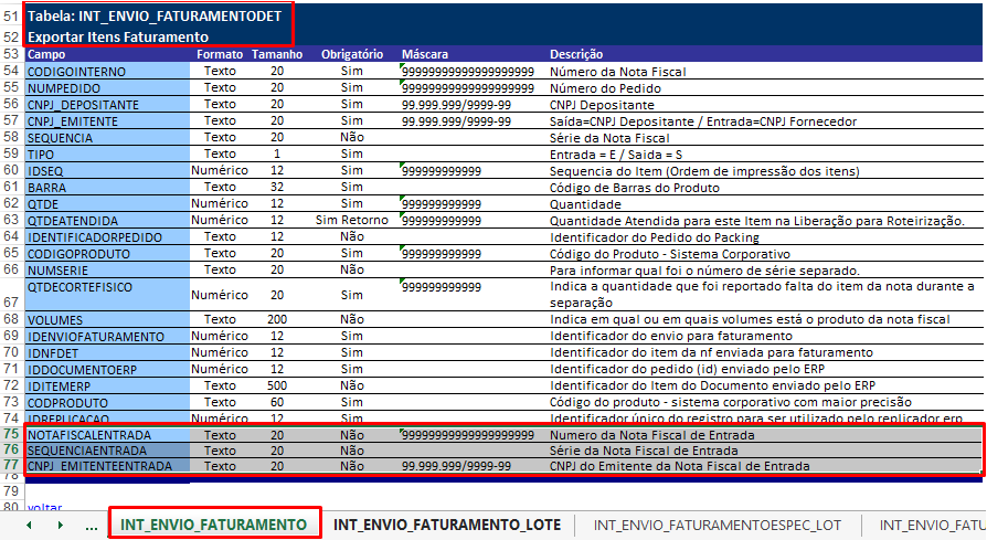 Hemos adaptado el diseño de exportación de la Plantilla de elementos de facturación:vi_int_envio_facturacióndet - cuando el parámetroEnviar factura con factura de entrada del Registro de Depositante está verificado, envíe la siguiente información: Número de la(s) Factura(s) recibida(s), Serie de la Factura recibida y CNPJ del Emisor de la Factura recibida.