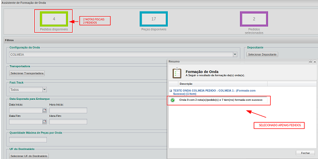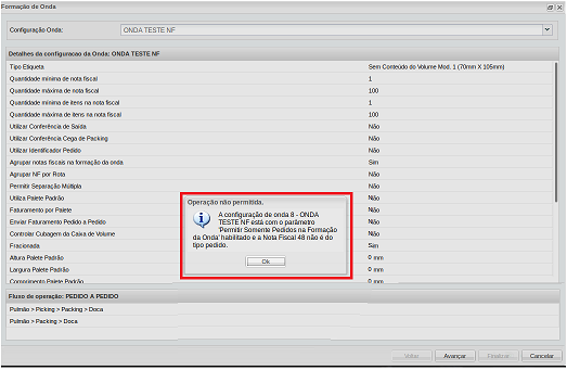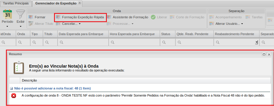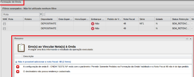Si el parámetroPermitir solo pedidos en formación de olas está marcado, el sistemano le permite seleccionar notas para elformación ola, solo pedidos. Muestra el mensaje de advertencia:Configuración de onda 8: NF Test Wave tiene el parámetro "Permitir solo pedidos en formación de onda" habilitado y la factura 48 no es del tipo de orden.