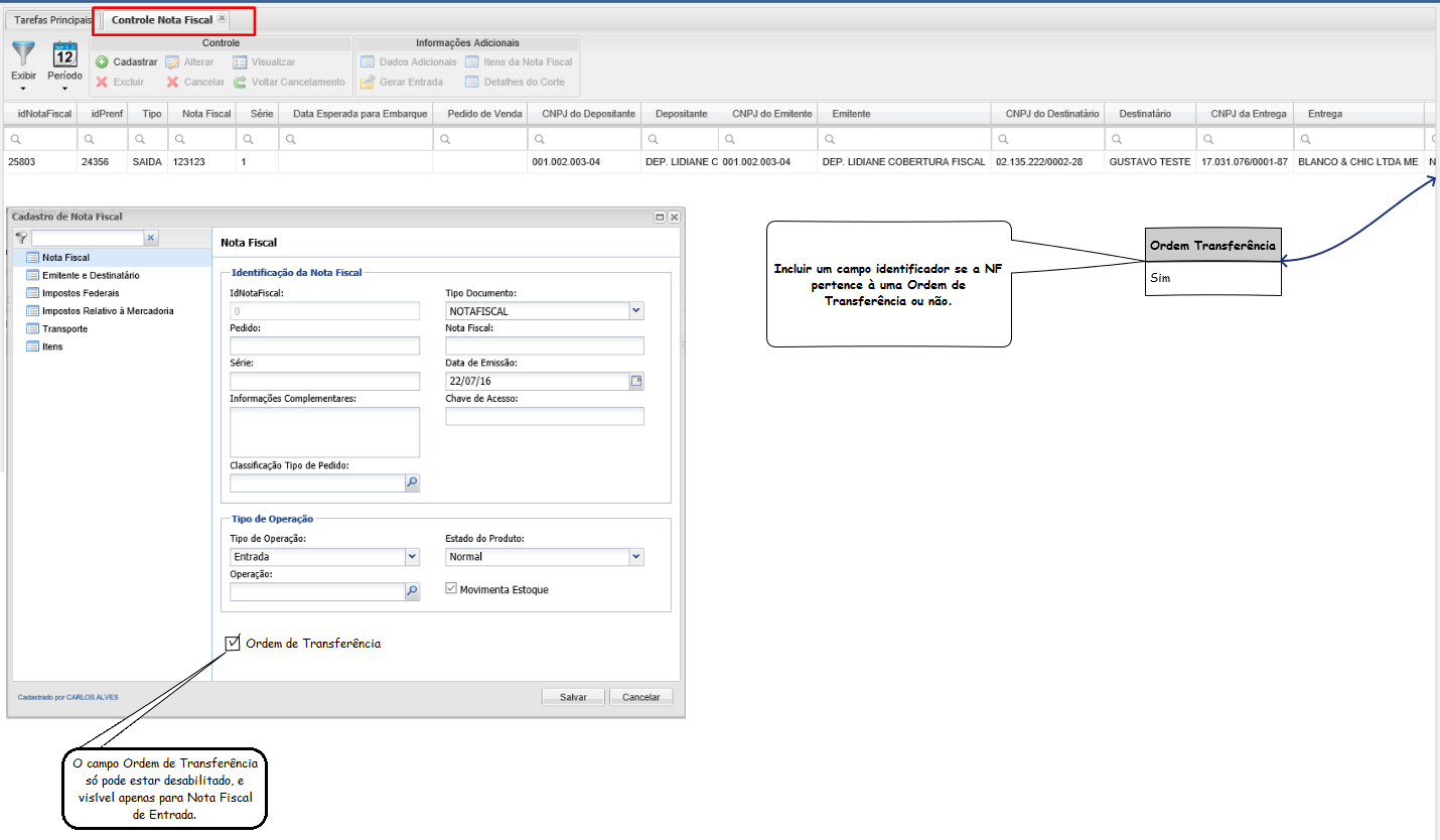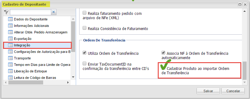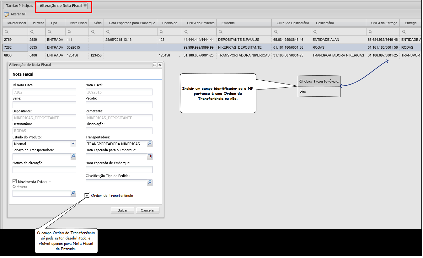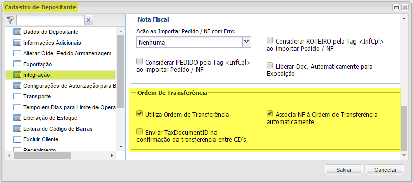 - La importación de Ítems NFe fue adecuada para que, en el caso del depositante, además de estar configurados paraUsar orden de transferencia, también está configurado paraAsociar automáticamente la factura a la Orden de transferencia, en el momento de la importación, se produce el enlace automático del NF a la Orden de Transferencia (si existe).