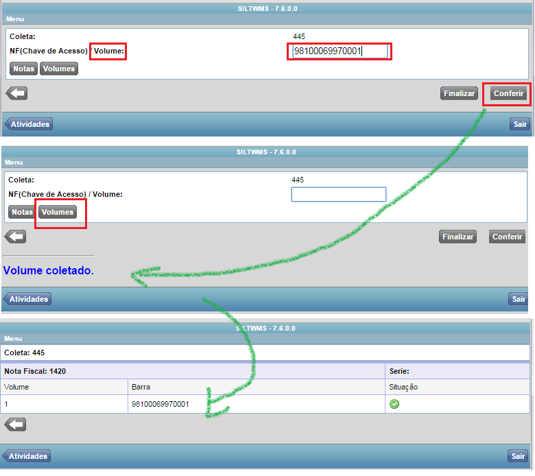 muestra la factura y uno o más volúmenes asociados. A partir de la versión 7.8.0.0 se realizó un ajuste en la verificación del marcado de parámetrosRecoger solo a través de la etiqueta de entrega en la configuración de Almacén, para presentar el mensaje que el usuario ingresa con elBarra de volumen generado que también se muestra en el Administrador de volumen / columna "Barra de etiquetas de entrega" yno lo que se informa en la “Barra” del Volumen.