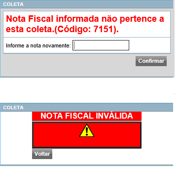 - Nota fiscal muestra un mensaje en color rojo que indica “La factura no pertenece a la colección. Código:XXXXXX", ser XXXXX el código de barras leído emitiendoSonido de advertencia.