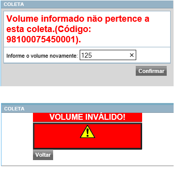Si el parámetro "Realizar recolección solo mediante etiqueta de entrega" está marcado en la configuración del almacén, el sistema muestra el mensaje para que el usuario ingrese elBarra de volumen generado, también se presenta en el Administrador de Volumen / columna “Barra de Etiquetas de Entrega” y no lo que se informa en la “Barra” del Volumen.