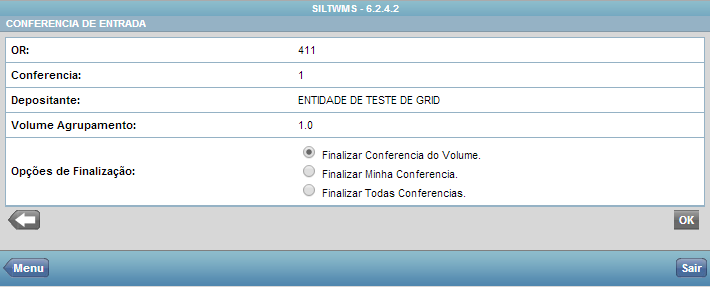 Con el parámetro activado, el sistema pregunta qué volumen se está comprobando, agrupando todos los productos, con las cantidades y al hacer clic en el botón "Finalizar", aumenta una opción a "Finalizar Comprobación de Volumen", pudiendo comprobar todos los volúmenes, Siempre que no exceda la cantidad especificada en el Registro de Recibo, la secuencia es informar el volumen, la barra de empaque, la cantidad y solo luego Finalizar la Verificación de Volumen.