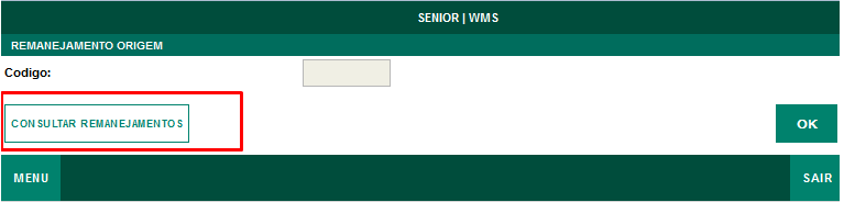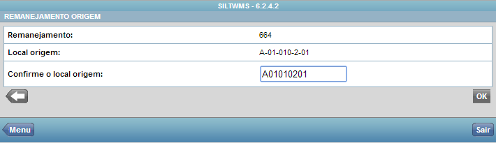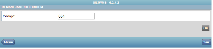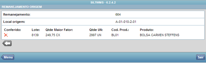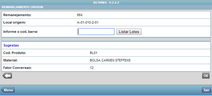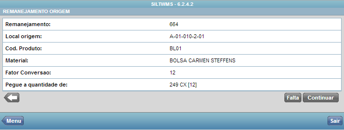 No Coletor de Dados / Remanejamento Origem o sistema solicita o código do remanejamento previamente cadastrado, direcionando o funcionário/separador para o local informado na tela do coletor de dados, exibe a lista de lotes a partir do botão “Listar Lotes” e após informar o sistema com o código de barras do produto, o separador pode clicar no botão “Falta” para informar a quantidade que existe no endereço, ou se clicar no “Continuar”, o sistema entende que o local de origem contém a quantidade informada na tela do Colector de datos.