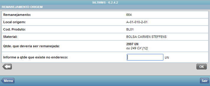 Si hace clic en el botón Falta, es necesario informar la cantidad que se encontró, es decir, si la cantidad encontrada es menor que la cantidad solicitada en la reubicación.