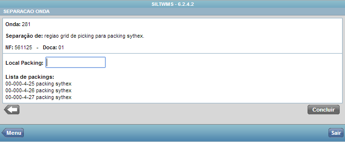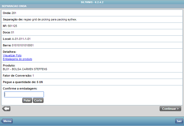 Los datos de separación del producto, el código de barras del empaque, la descripción del producto, el factor de conversión, la cantidad necesaria para eliminar el sitio se muestran en la pantalla, se permite usar los botones "Ver foto": donde se muestra la foto del producto, que estaba vinculada en el Registro de productos y "Embalaje de productos": enumera todos los embalajes de productos. Al hacer clic en los botones "Omitir": que informa al sistema que la ubicación es visitada en otro momento o "Cortar": demuestra al sistema que no hay la cantidad requerida ingresada en la ubicación, requiriendo la activación del parámetro "Usos físicos Cortar "en Configuración de almacén. Nota: Pero activar o no este parámetro depende de la gestión del almacén. La decisión de Corte físico se completa en la pantalla Empresa de sedimentos / Monitoreo / Corte físico.