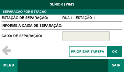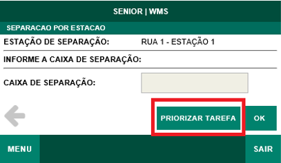 Al ingresar a una caja retornable, el sistema busca una tarea de clasificación y la vincula a la caja, sin embargo, si hay un pedido con alta prioridad, el usuario puede usar el botónPriorizar tarea, Como se muestra abajo. Luego de seleccionar la tarea deseada, el usuario es dirigido nuevamente a la pantalla donde se debe ingresar el cuadro separador, que está vinculado a la tarea seleccionada.
