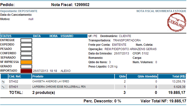 Si hace clic en la línea queno Está resaltado, el sistema muestra el Estado con sus respectivas Fechas, Horas y Usuarios Responsables, además de informar la Factura / Pedido, Destinatario, Transportista, CFOP, Cantidad de artículos y lista de productos con sus cantidades y valores.