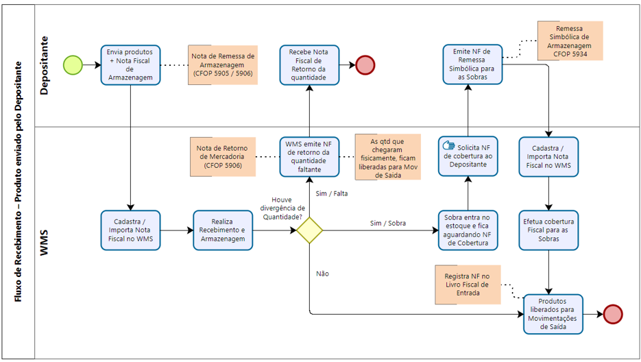 Cuando la mercancía llega con una NF-e emitida por el propio depositante y el almacén general es el destinatario, esta carga ya está fiscalmente cubierta y liberada para movimiento. Sin embargo, si se identifica una divergencia entre el NF físico y el NF, es posible emitir un NF de devolución alfalta de mercancías y en caso desuperávit el saldo se encuentra bloqueado a la espera de la factura de cobertura. Siga el flujo a continuación: