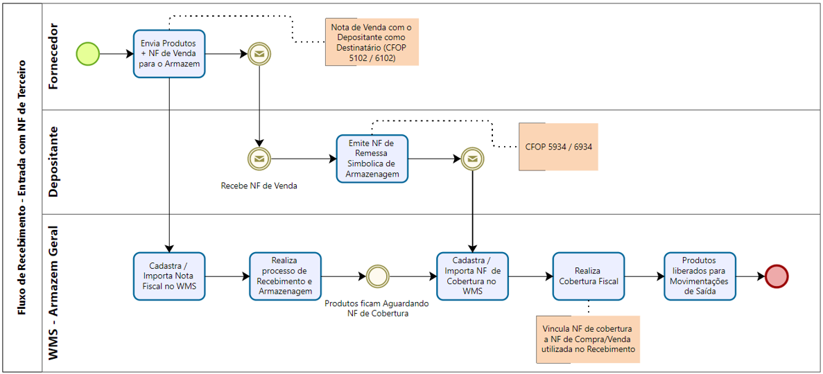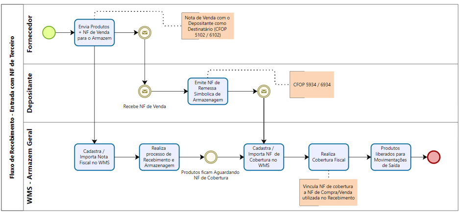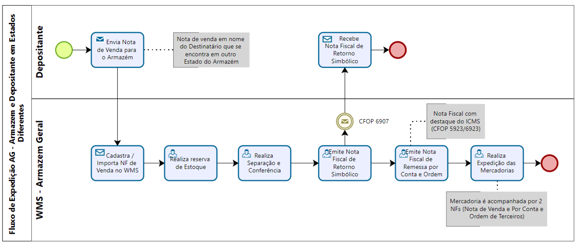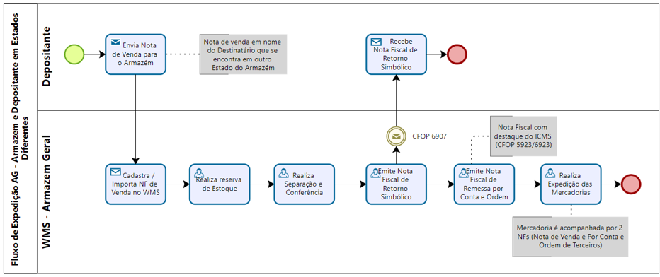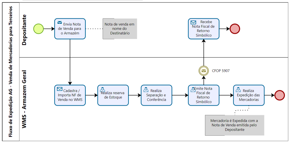 En este proceso, cuando el depositante realiza una venta al cliente, se debe imprimir una factura de envío a nombre de un tercero, esta NF acompañará la mercancía con la nueva NF de venta como referencia. Siga el flujo a continuación