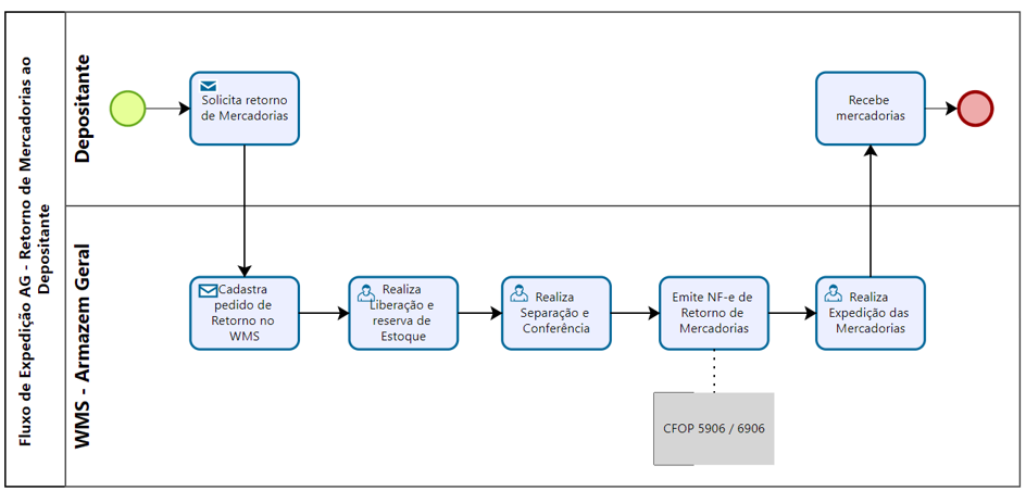 Si el depositante solicita la devolución de la mercancía que se encuentra en el almacén, está sujeto aResponsabilidad del almacén general de realizar todo el proceso. separación, verificación y emisión de factura de devolución de bienes almacenados con CFOP 5906 o 6906, luego los bienes se envían al depositante.