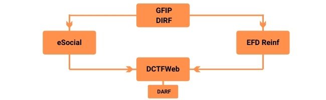 As informações relacionadas a área trabalhistas serão enviadas ao eSocial, já as informações tributárias irão ser declaradas na EFD Reinf. Logo após o envio das duas obrigações para a DCTFWeb, será apurada e gerada automaticamente o Documento de Arrecadação da Receita Federal - DARF, para pagamento dos tributos.