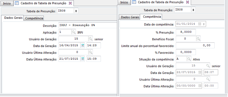 A presunção deve ser cadastrada na tela Cadastro de Tabela de Presunção (F055TPR) segue abaixo exemplo de cadastro: